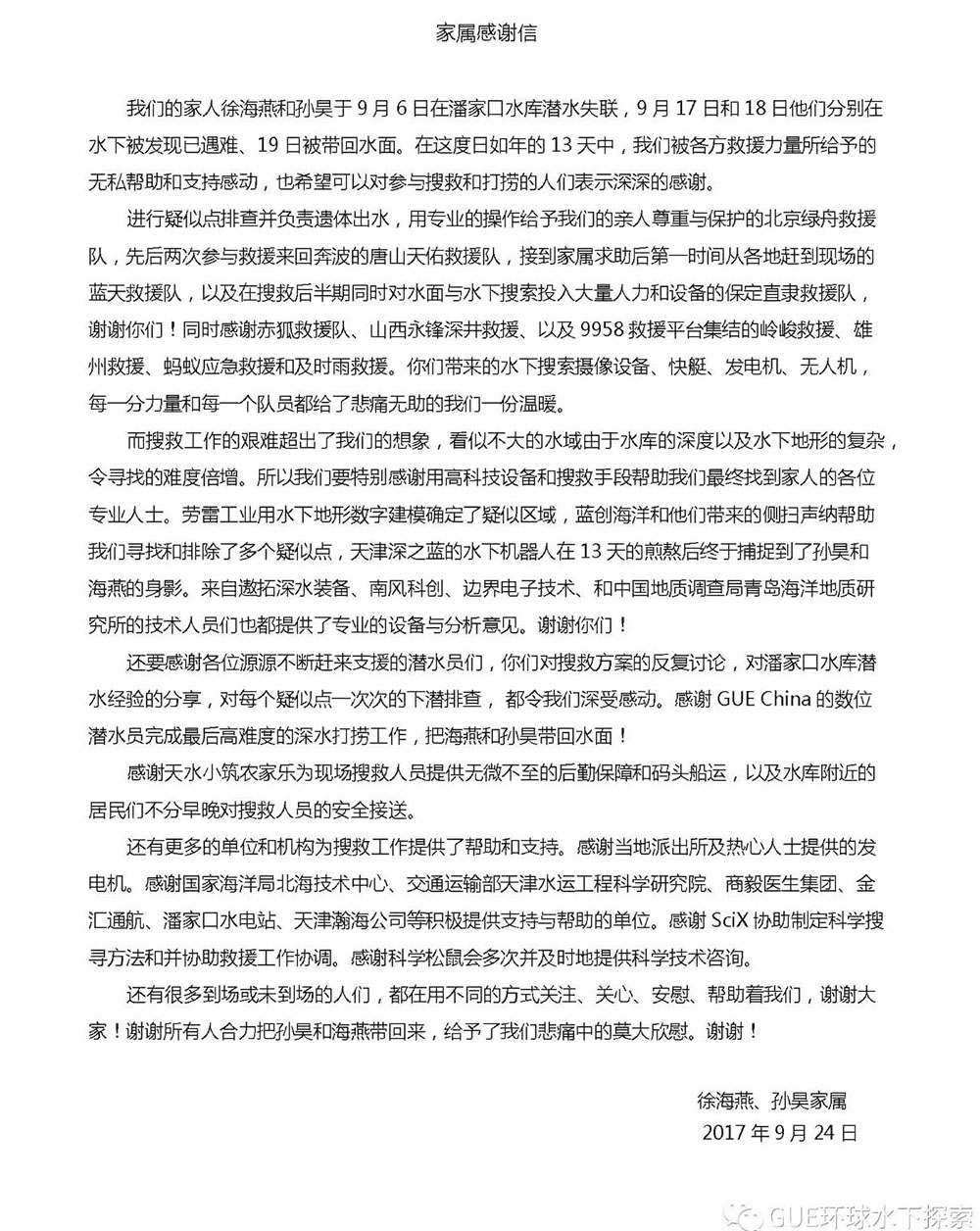 9月6日下午,在河北唐山潘家口水下長(zhǎng)城探索項(xiàng)目中,兩名潛水愛好者徐海燕和孫昊結(jié)伴下潛,意外失蹤。GUE(全球水下探險(xiǎn)家)聯(lián)合當(dāng)?shù)鼐脚c各方搜救力量立即展開搜尋工作,勞雷也快速集結(jié)力量全力參與到搜尋工作中。9月17日、18日,兩名潛水愛好者的遺體相繼被找到,19日中午和傍晚,兩名潛水員的遺體被相繼打撈出水。