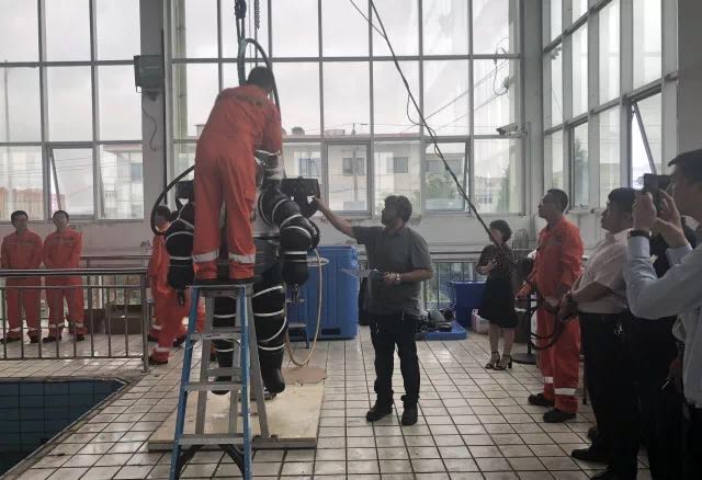 會(huì)后,與會(huì)代表在青島太平洋公司潛水員訓(xùn)練場觀摩了ADS常壓潛水系統(tǒng)的下水訓(xùn)練,身臨其境的感受了設(shè)備入水、水下移動(dòng)、穿纜作業(yè)、水下重物吊掛等環(huán)節(jié),并對(duì)該系統(tǒng)的使用體驗(yàn)給予了高度的評(píng)價(jià)。